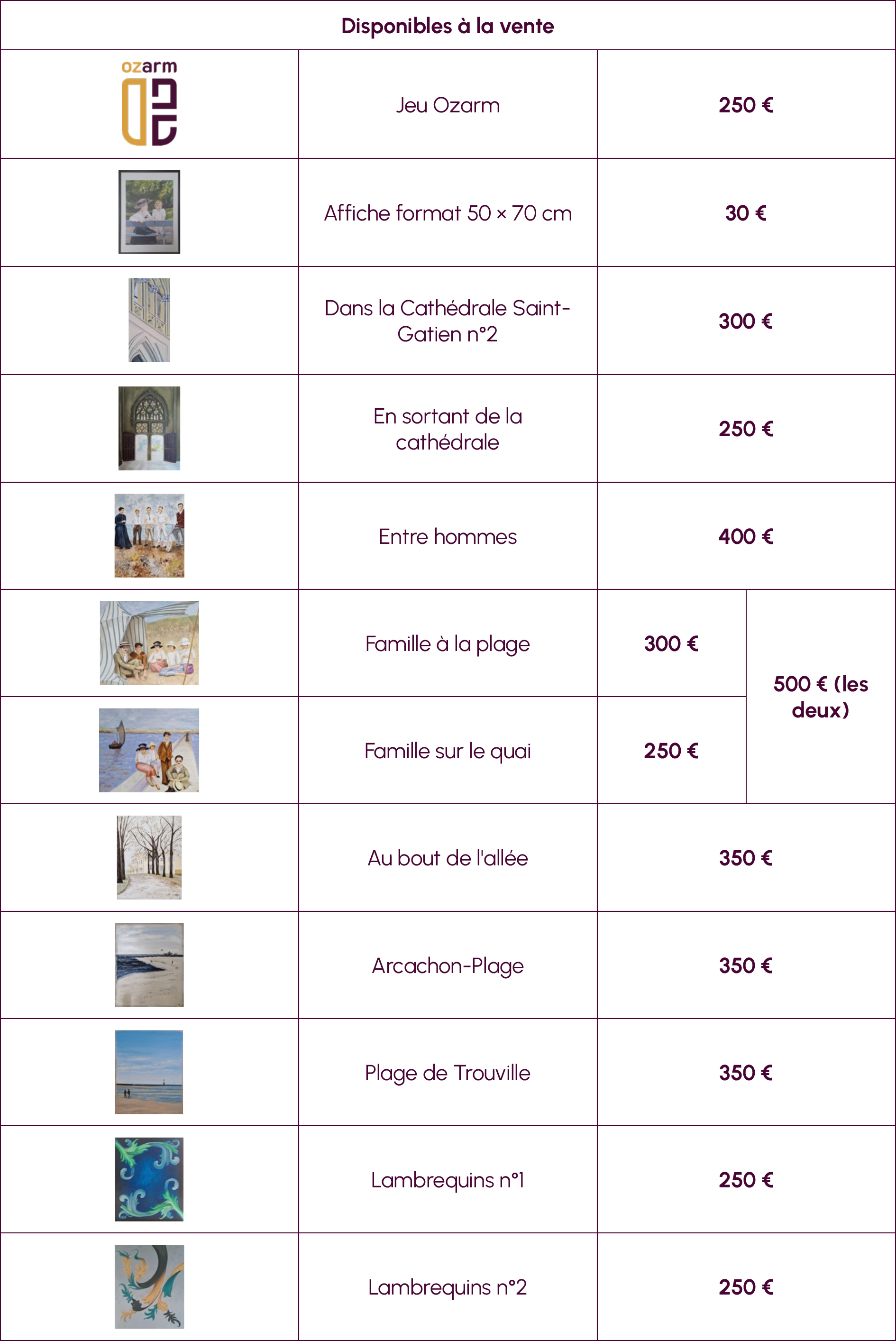 Les tarifs sont fonction de la difficulté de l’œuvre, du format envisagé et de la technique employée. Toute commande (tableaux de famille d’après photo, blasons, copies de tableaux) fera l’objet d’un devis.